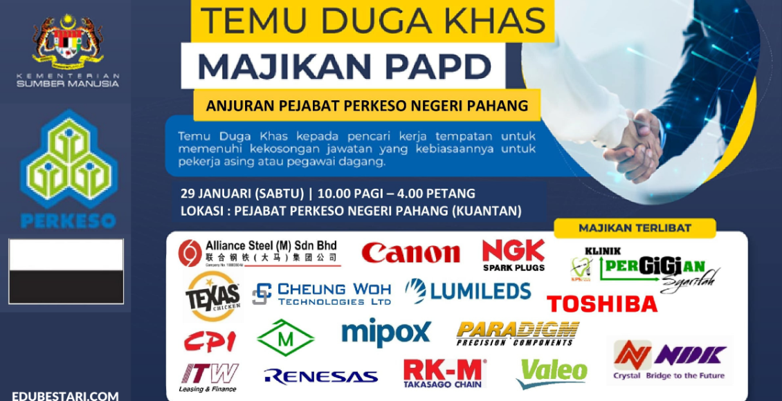 Anjuran Pejabat Perkeso Negeri Pahang memberi peluang kepada pencari kerja di luar sana untuk hadiri temuduga terbuka secara fizikal dengan pelaksanaan Karnival Kerjaya Temuduga Khas Majikan PAPD nanti. Lebih 200 kekosongan jawatan ditawarkan kepada warganegara Malaysia.