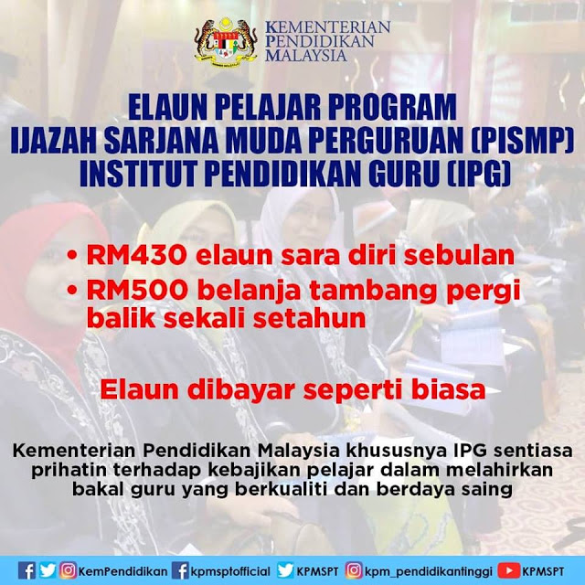 Elaun Sara Hidup bagi siswa guru IPG masih dikekalkan sehingga kini iaitu pelajar PPISMP dan PIMP menerima jumlah yang sama sebanyak RM430 sebulan.