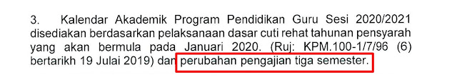 Namun, mulai tahun ini (2020), pengajian di IPG dipecahkan kepada TIGA SEMSTER dalam setahun iaitu Semester 1 bermula pada bulan Januari hingga Mei, Semester 2 bermula pada bulan Jun hingga Oktober dan Semester 3 bermula pada bulan November hingga Disember).