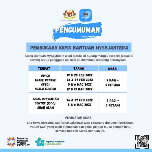 Anda ada masalah dengan aplikasi atau akaun MySejahtera anda? Bagi yang dah cuba minta bantuan melalui helpdesk di MySejahtera tetapi masih belum anda solusi, anda boleh terus ke Kiosk Bantuan MySejahtera yang akan dibuka nanti di lokasi dan tarikh yang ditetapkan!