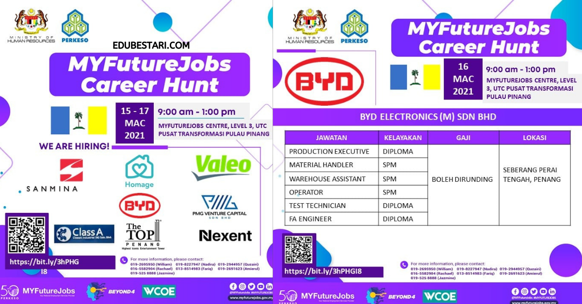 - Lokasi: MYFutureJobs Centre, Level 3, UTC Pusat Transformasi Pulau Pinang