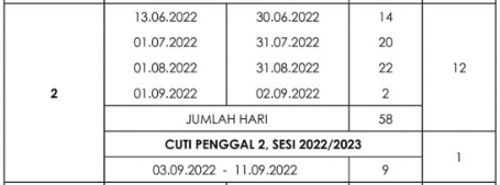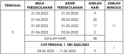 - Cuti Penggal 1 Sesi 2022/2023: 3 Jun 2022 hingga 11 Jun 2022