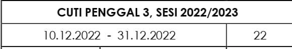Tarikh Cuti Sekolah Penggal 3 Sesi 2022/2023 Bulan Disember 2022