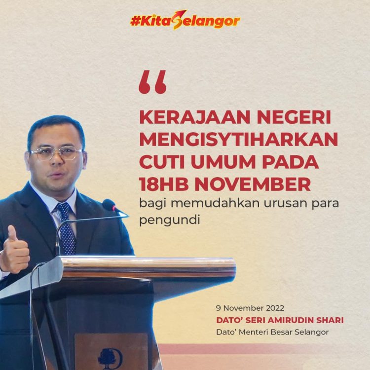 Oleh yang demikian, kerajaan negeri memutuskan secara amnya untuk memberikan cuti umum sehari sebelum Pilihan Raya Umum Ke-15 (PRU-15) iaitu pada Jumaat, 18 November.