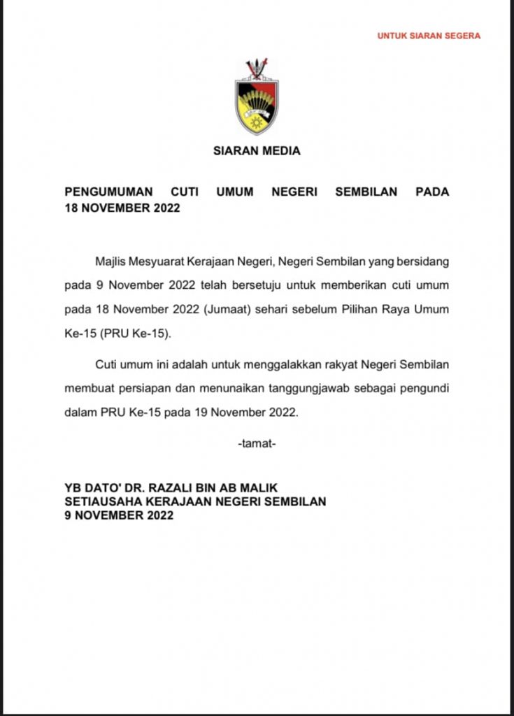 Cuti Umum Negeri Sembilan pada 18 November 2022 Sempena PRU-15