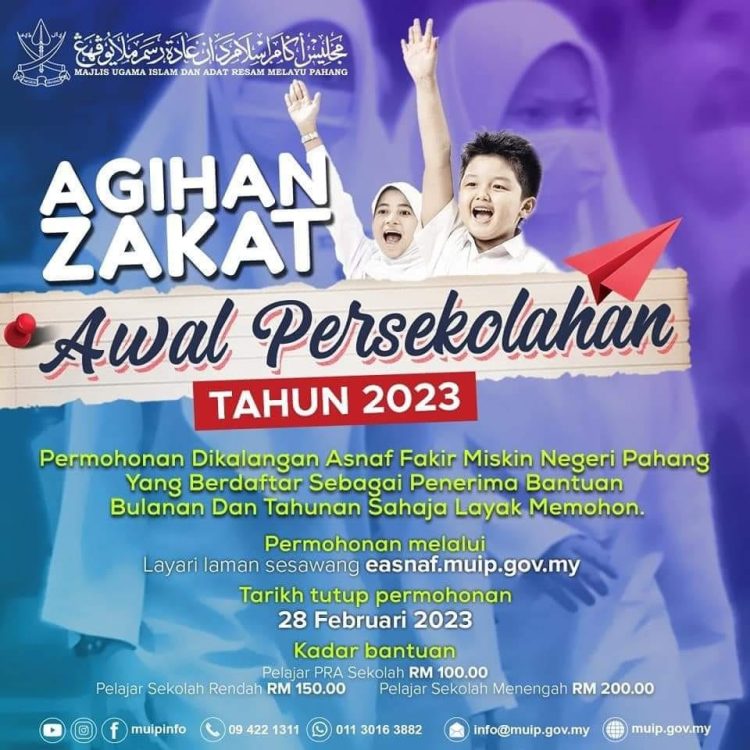 Permohonan dikalangan Asnaf Fakir Miskin Negeri Pahang yang berdaftar sebagai penerima bantuan dan tahunan layak memohon Agihan Zakat Awal Persekolahan tahun 2023. Bantuan tunai yang ditawarkan ini adalah bagi memudahkan urusan pendaftaran anak Pra Sekolah, Sekolah Rendah dan Sekolah Menengah.