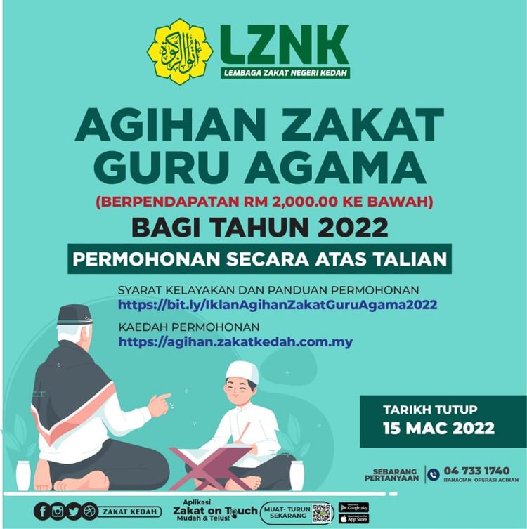 Permohonan Agihan Zakat Guru Agama Lembaga Zakat Negeri Kedah tahun 2022 dibuka sehingga: