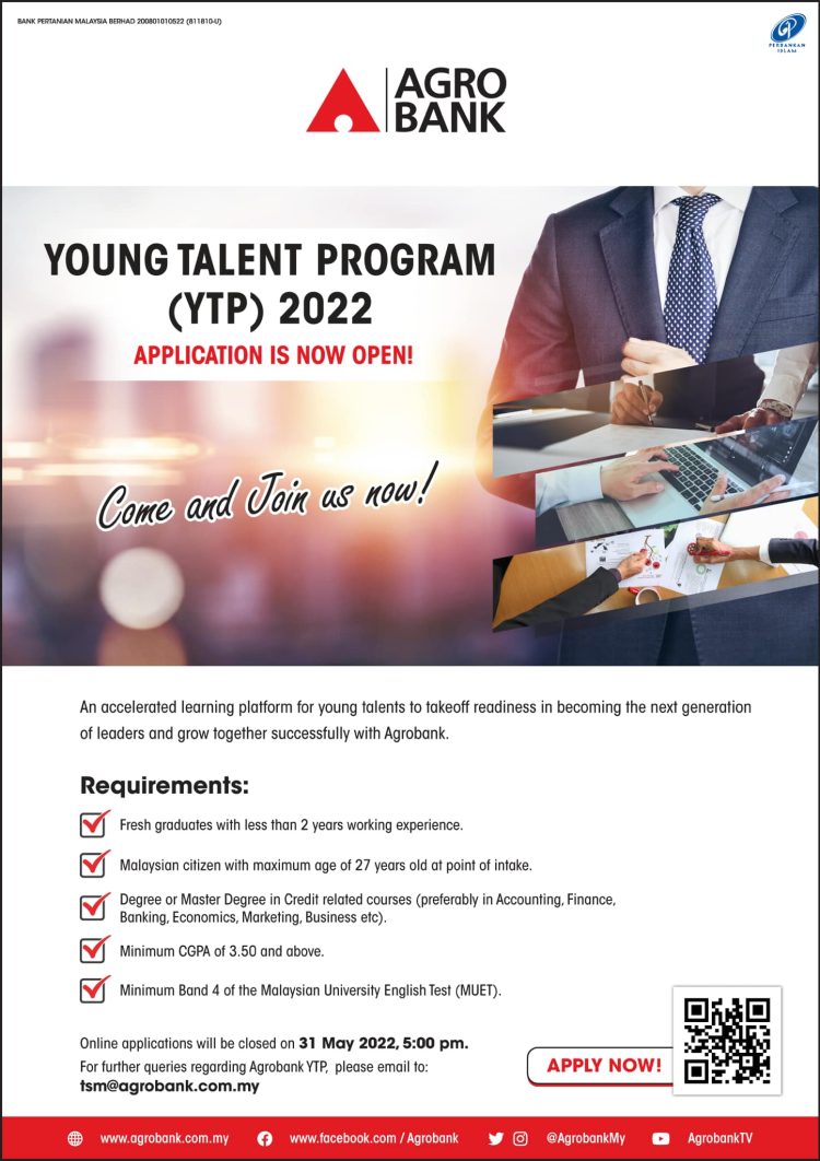 Adakah anda telah menamatkan Ijazah Sarjana Muda atau Sarjana Muda dan ingin memulakan kerjaya dalam perbankan? Jom sertai Program Young Talent Agrobank bagi tahun 2022! Young Talent Program (YTP) Agrobank menawarkan pembangunan bakat yang menarik dan tersusun untuk mengubah graduan menjadi seorang pekerja dalam bidang perbankan yang berkualiti.