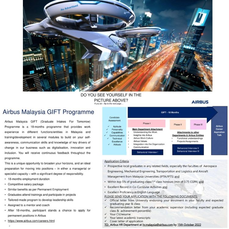 Adalah dimaklumkan Airbus Malaysia menjemput calon-calon yang berkelayakan untuk memohon program Airbus Graduate Intake for Tomorrow Program (GIFT). Program selama 18 bulan ini membolehkan graduan menyesuaikan diri dengan cepat dalam persekitaran kerja profesional, menerima pembangunan kemahiran yang relevan dan mendapatkan pengalaman praktikal yang akan membentuk mereka menjadi nilai Korporat Syarikat Airbus.