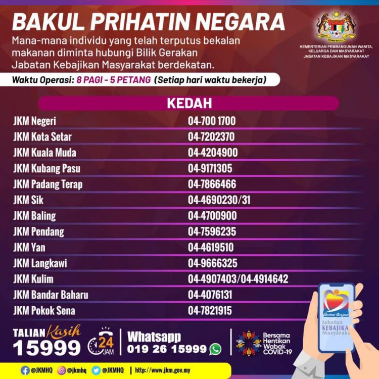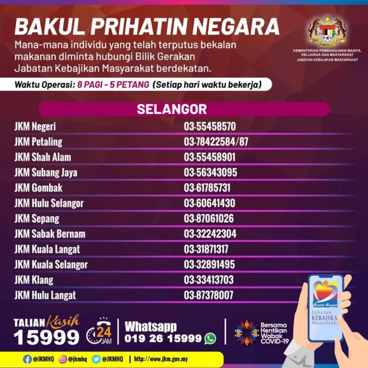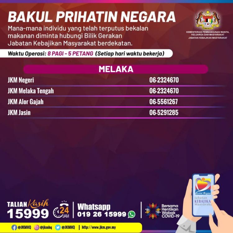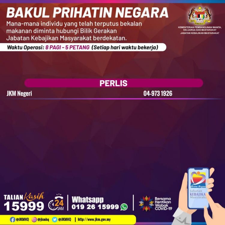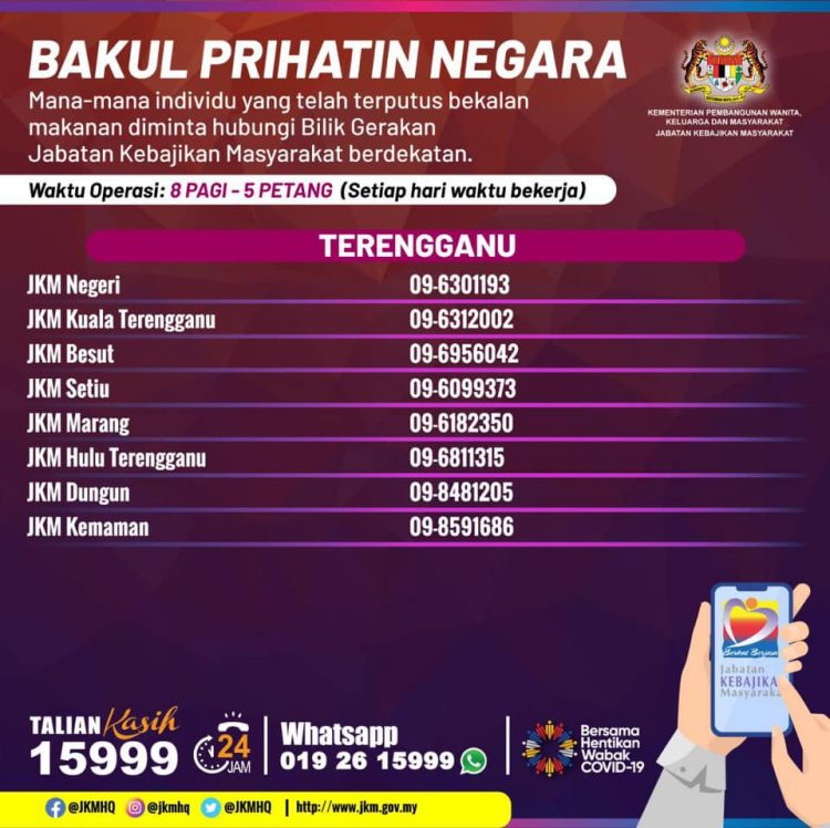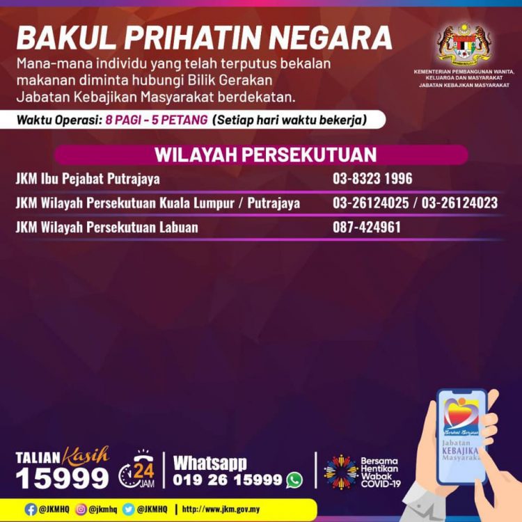 Untuk maklumat lanjut atau sebarang pertanyaan berkenaan permohonan Bakul Prihatin Negara, anda boleh hubungi Talian Kasih di talian 15999 atau WhatsApp ke 019 261 5999.