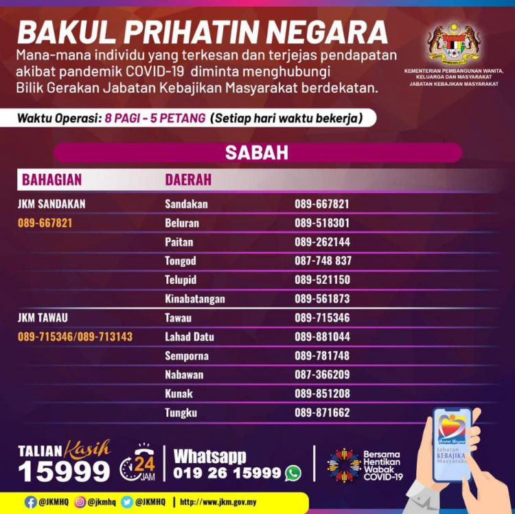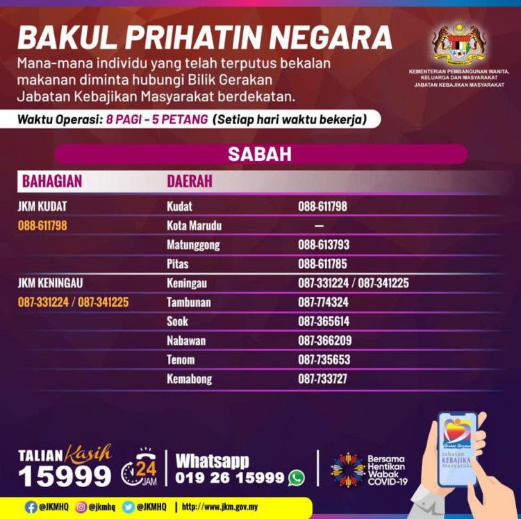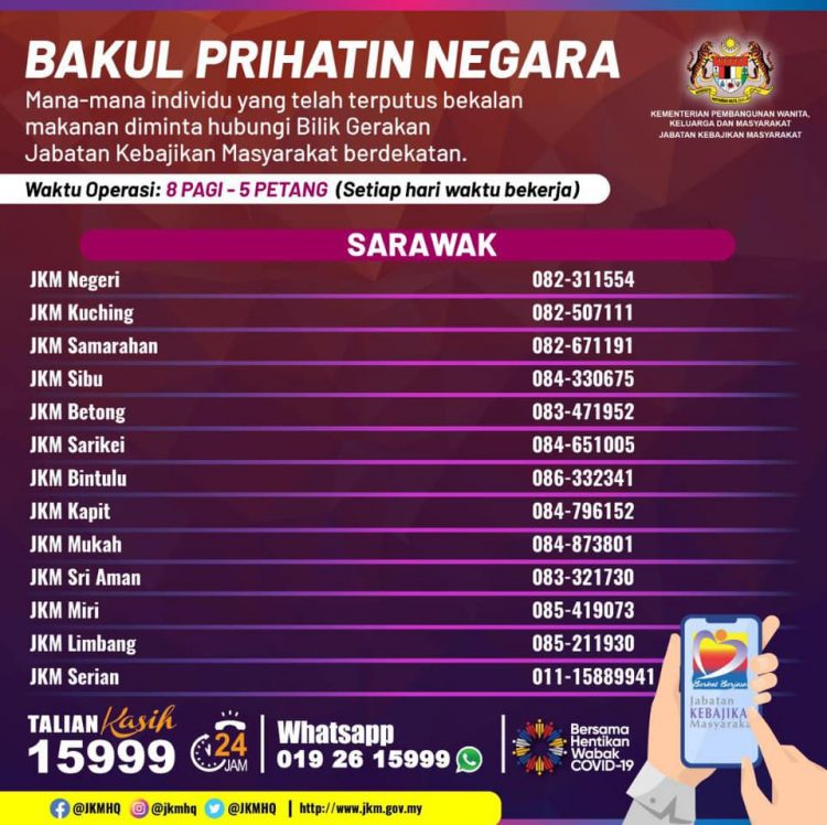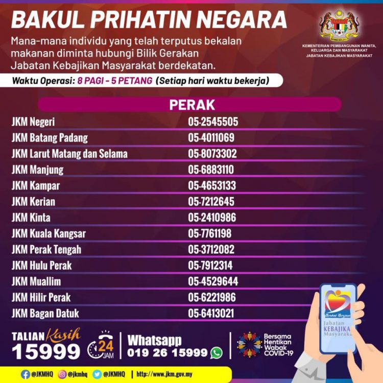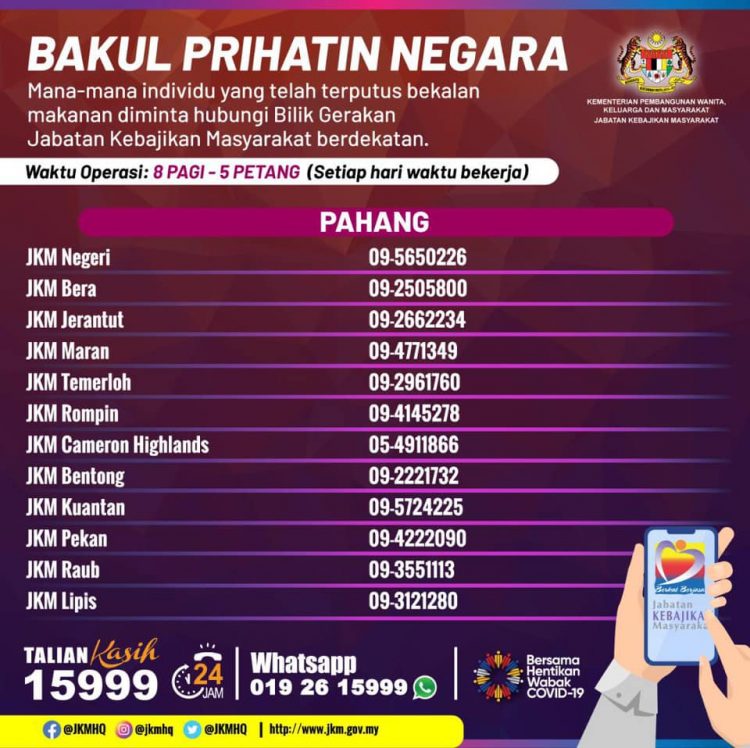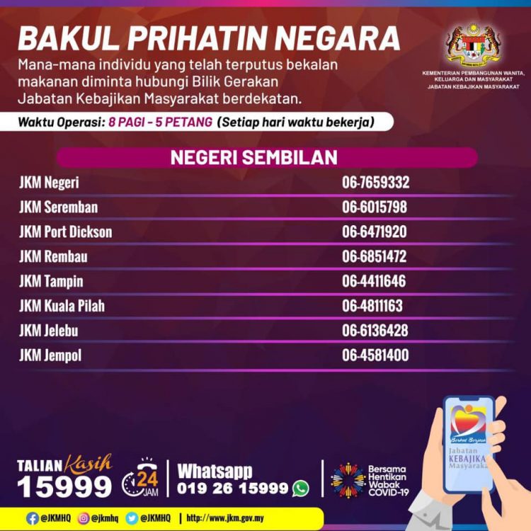 Untuk maklumat lanjut atau sebarang pertanyaan berkenaan permohonan Bakul Prihatin Negara, anda boleh hubungi Talian Kasih di talian 15999 atau WhatsApp ke 019 261 5999.