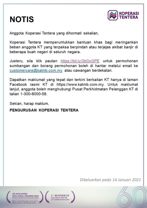 Makluman penting buat Anggota Koperasi Tentera. Koperasi Tentera memperuntukkan bantuan khas bagi meringankan beban anggota KT yang terpaksa berpindah atau terjejas akibat banjir di beberapa buat negeri di seluruh negara.