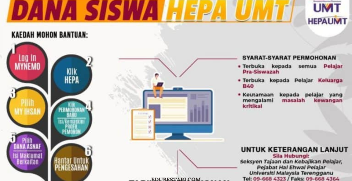 Pejabat Hal Ehwal Pelajar (PHEP) Universiti Malaysia Terengganu (UMT) kini membuka tawaran Bantuan Dana Siswa HEPA UMT untuk pelajar B40 yang berkelayakan. Bantuan ini disasarkan bagi meneruskan proses pembelajaran para siswazah dengan lebih lancar demi mencapai kejayaan akademik yang lebih cemerlang.