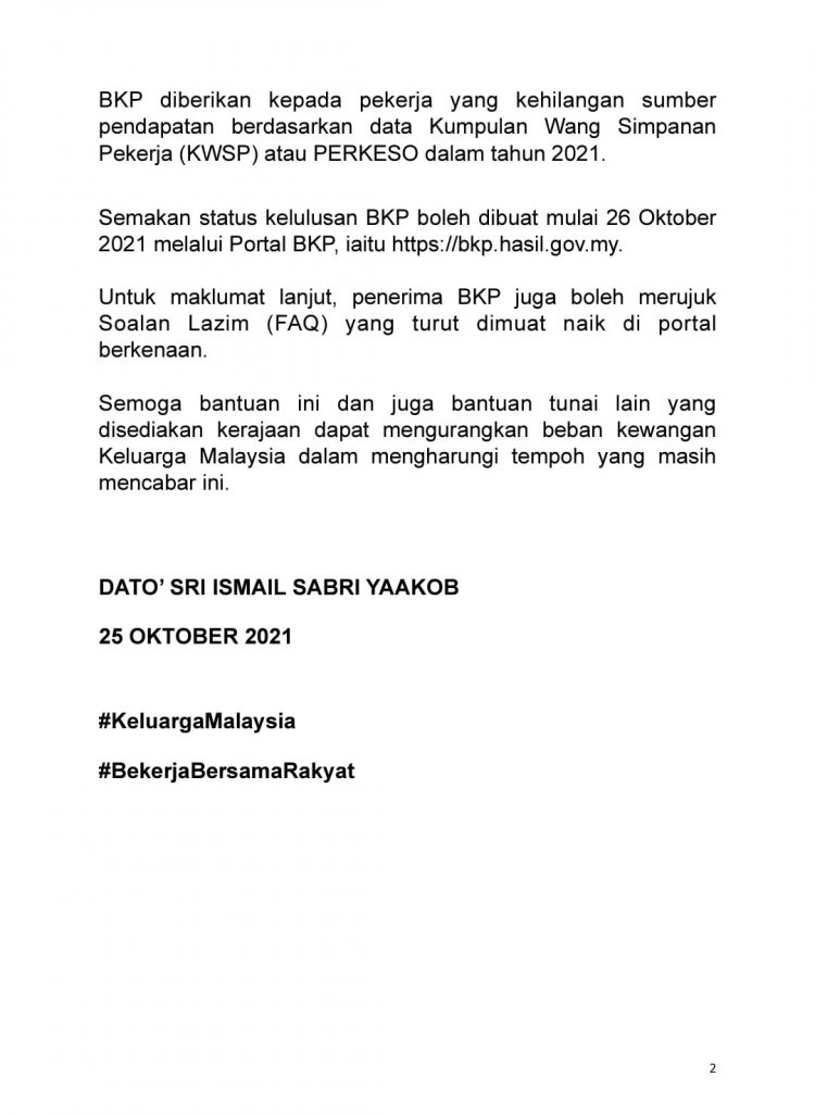 Kerajaan sedar kehidupan ramai di kalangan saudara-saudari yang terjejas teruk akibat lebih setahun berperang dengan pandemik COVID-19. Walaupun berjuta rakyat Malaysia telah menerima manfaat bantuan tunai dari Kerajaan sejak Mac 2020 dan ramai lagi menerima bantuan kerajaan dalam bentuk yang pelbagai, kerajaan faham bantuan perlu terus dipertingkat selagi kemelut ini berlanjutan.