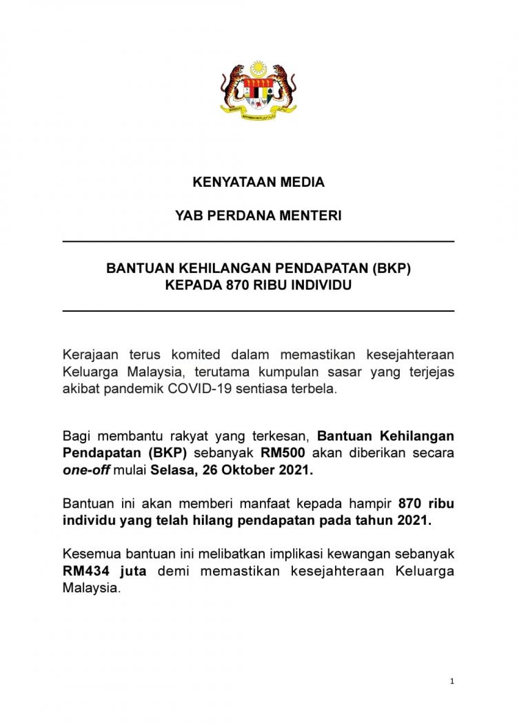Terkini, kerajaan telah mengumumkan akan memberikan Bantuan Kehilangan Pekerjaan pada bulan Oktober 2021 kepada individu yang kehilangan pekerjaan.