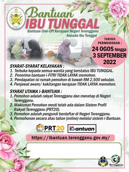 Mulai 24 Ogos 2022, semua wanita yang berstatus ibu tunggal di negeri Terengganu yang berkelayakan boleh mohon Bantuan Ibu Tunggal secara one-off yang ditawarkan oleh Kerajaan Negeri Terengganu kepada ibu tunggal bagi meringankan beban. Permohonan bagi ibu tunggal yang berkelayakan boleh dibuat secara atas talian melalui i-Bantuan.