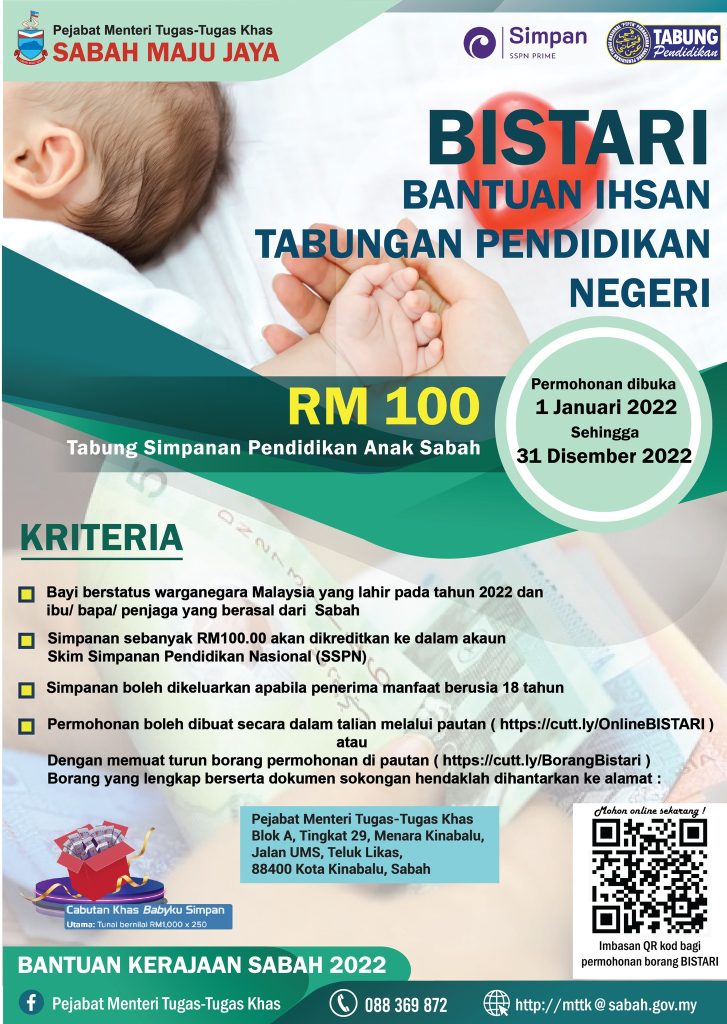 Tawaran Bantuan Ihsan Tabungan Pendidikan Negeri (BISTARI) RM100 Buat Setiap Bayi