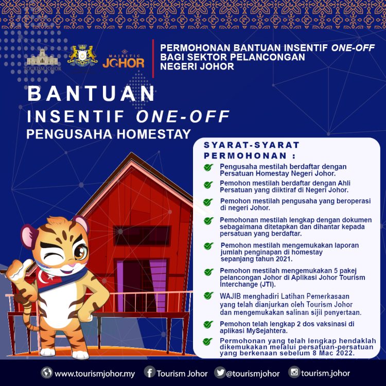 Untuk maklumat lanjut berkenaan bantuan insentif Sektor Pelancongan Johor yang ditawarkan, anda boleh terus ke laman www.tourismjohor.my