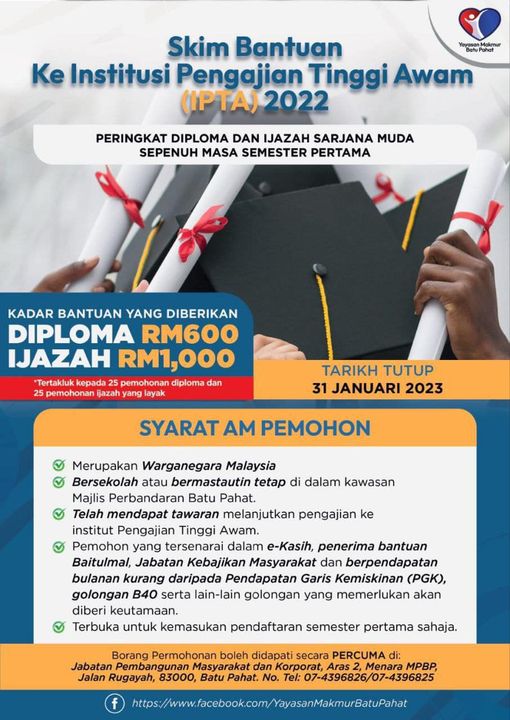 Yayasan Makmur Batu Pahat, sebuah NGO kebajikan dibawah Majlis Perbandaran Batu Pahat (MPBP) kini menawarkan Skim Bantuan ke IPTA terbuka kepada calon di daerah Batu Pahat yang dapat peluang menyambung pengajian peringkat Diploma dan Ijazah Sarjana Muda di Institut Pengajian Tinggi Awam (IPTA).