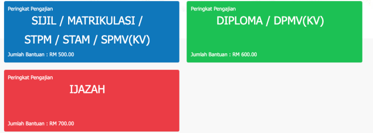 - Setiap peringkat pengajian hanya sekali sahaja bantuan akan diberi.
