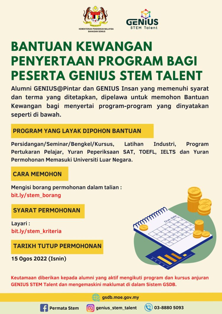 Kementerian Pendidikan Malaysia Bahagian Genius menawarkan Bantuan Kewangan Penyertaan Program bagi peserta Genius STEM Talent. Keutamaan diberikan kepada alumni yang aktif mengikuti program dan kursus anjuran GENUIS STEM Talent dan mengemaskini maklumat di dalam Sistem GSOB.