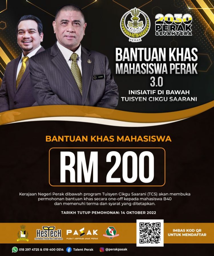 Kerajaan Negeri Perak dibawah program Tuisyen Cikgu Saarani (TCS) akan membuka permohonan bantuan khas secara one-off kepada mahasiswa B40 dan memenuhi terma dan syarat yang ditetapkan. Bantuan ini adalah bertujuan untuk membantu mahasiswa dalam meringankan beban keluarga.