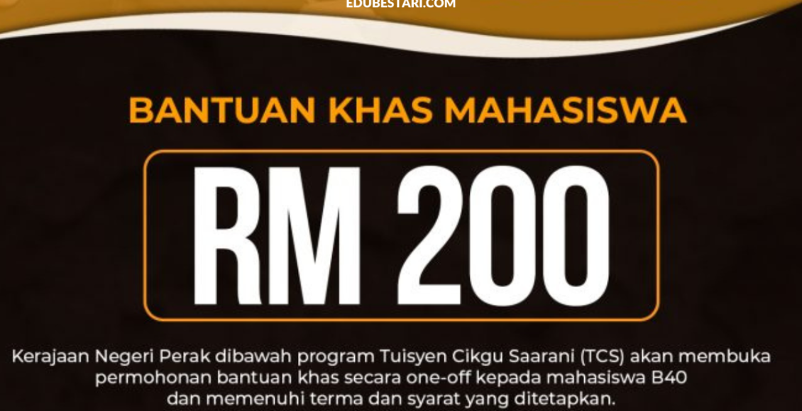 Kerajaan Negeri Perak dibawah program Tuisyen Cikgu Saarani (TCS) akan membuka permohonan bantuan khas secara one-off kepada mahasiswa B40 dan memenuhi terma dan syarat yang ditetapkan. Bantuan ini adalah bertujuan untuk membantu mahasiswa dalam meringankan beban keluarga.