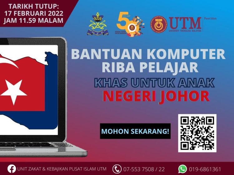 Panggilan buat pelajar Universiti Teknologi Malaysia (UTM) yang tiada komputer riba dan berkelayakan serta berasal dari Negeri Johor. Anda dipelawa untuk memohon bantuan komputer riba ini. Bantuan komputer riba ini disumbangkan oleh Majlis Agama Islam Johor dengan kerjasama Unit Zakat & Kebajikan Pusat Islam UTM Johor.