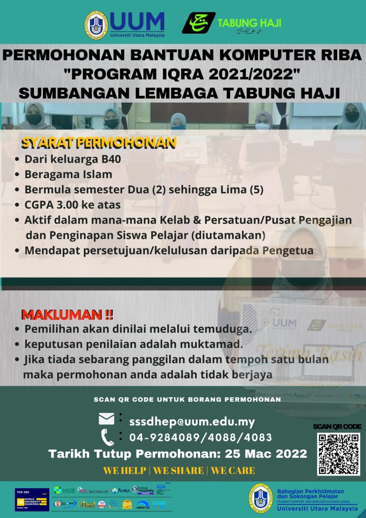Sukacita dimaklumkan bahawa Bahagian Perkhidmatan dan Sokongan Hal Ehwal Pelajar UUM (SSSD), HEP UUM dengan kerjasama Tabung Haji melalui “Program Iqra 2021/2022 TH” kini membuka permohonan Bantuan Komputer Riba kepada pelajar Ijazah Sarjana Muda Sepenuh Masa, Universiti Utara Malaysia (UUM).