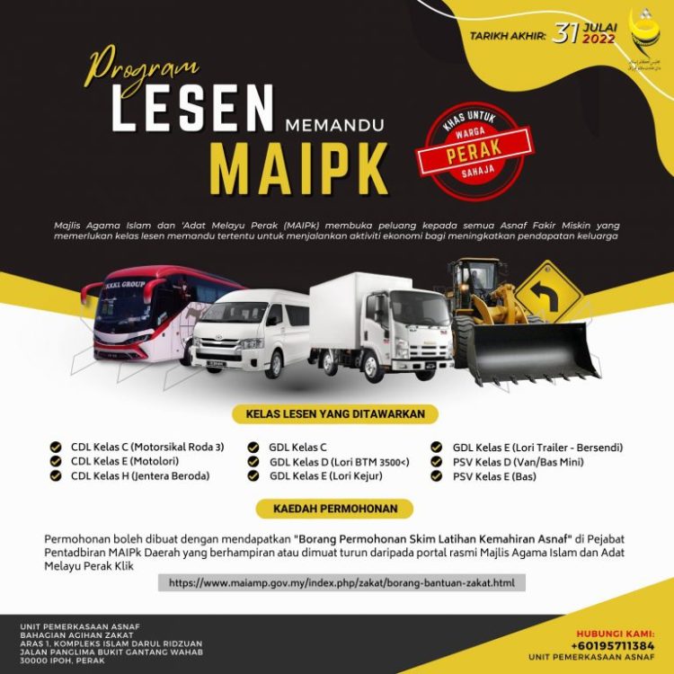 Majlis Agama Islam dan ‘Adat Melayu Perak (MAIPk) membuka peluang kepada semua Asnaf Fakir Miskin yang memerlukan kelas lesen memandu tertentu untuk menjalankan aktiviti ekonomi bagi meningkatkan pendapatan keluarga. Asnaf yang terpilih akan mengikuti program ini di salah satu daripada 3 institut memandu yang ditetapkan.
