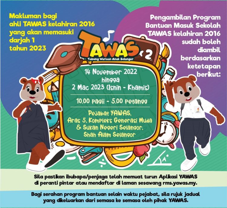 Serahan bagi Program Bantuan Masuk Sekolah TAWAS bagi ahli 2016 akan dilaksanakan di pejabat Yayasan Warisan Anak Selangor akan bermula mengikut ketetapan berikut: