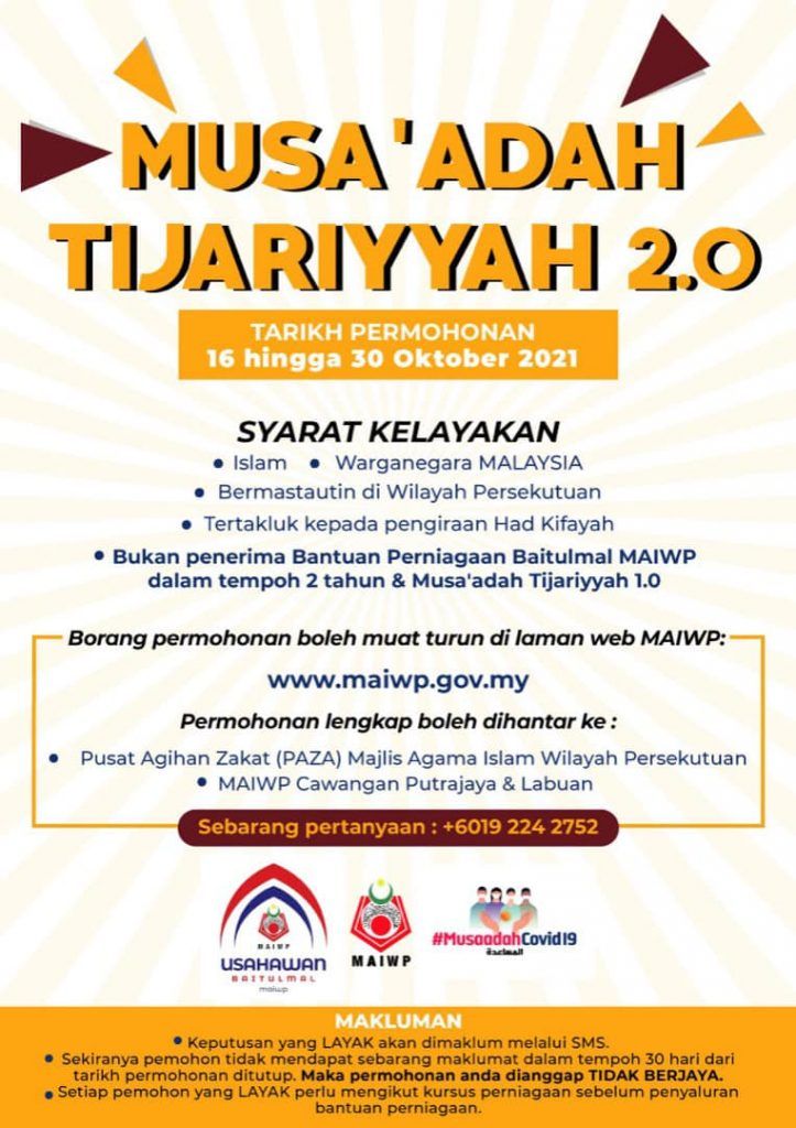 Majlis Agama Islam Wilayah Persekutuan (MAIWP) sebelum ini telah mengumumkan peruntukan sebanyak RM15 juta sebagai bantuan modal kepada mereka yang ingin memulakan atau mengembangkan perniagaan. Kini MAIWP meneruskan lagi bagi Musa’ adah Tijariyyah 2.0 buat peniaga yang terjejas.