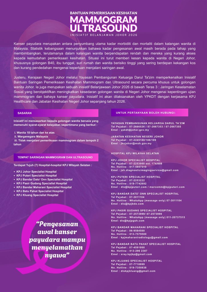 Bagi menangani isu ini, Kerajaan Negeri Johor melalui Yayasan Pembangunan Keluarga Darul Ta’zim (YPKDT) memperkenalkan Bantuan Pemeriksaan Kesihatan Mammogram dan Ultrasound di bawah Inisiatif Belanjawan Johor 2026.