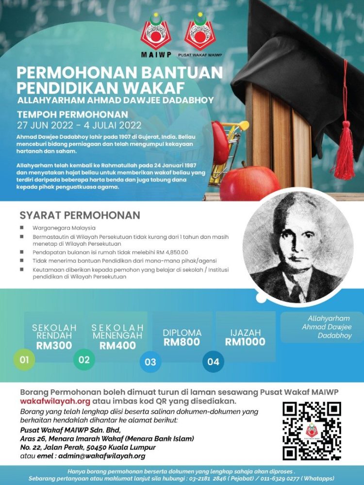 Majlis Agama Islam Wilayah Persekutuan (MAIWP) kini telah membuka tawaran Bantuan Pendidikan Manfaat Wakaf Allahyarham Ahmad Dawjee Dadabhoy. Tawaran bantuan ini terbuka kepada pelajar sekolah rendah, sekolah menengah, pelajar diploma dan pelajar ijazah.