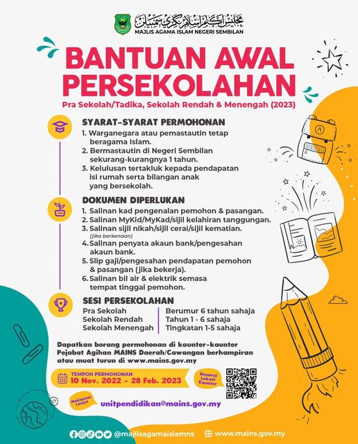 Majlis Agama Islam Negeri Sembilan (MAINS) mempelawa ibu bapa yang mempunyai anak sekolah dan bermastautin di Negeri Sembilan mohon Bantuan Awal Persekolahan MAINS Tahun 2023 yang ditawarkan. Permohonan boleh dibuat bermula dalam tempoh permohonan dibuka dengan menghantar borang permohonan dan dokumen di kaunter Pejabat Agihan MAINS Daerah berhampiran.