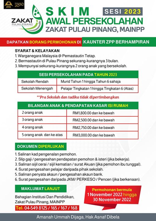 Permohonan Bantuan Awal Persekolahan tajaan Zakat Pulau Pinang bagi tahun 2023 dibuka sepanjang tempoh berikut: