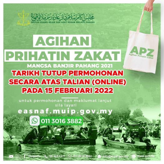Permohonan agihan prihatin zakat (APZ) kepada mangsa banjir negeri Pahang tahun 2021/2022 dibuka sehingga: