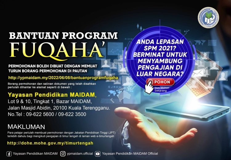 Yayasan Pendidikan Maidam mempelawa kepada pelajar lepasan SPM 2021 untuk memohon bantuan melanjutkan pengajian di Institusi Pengajian Tinggi Timur Tengah bagi Ijazah Sarjana Muda Tahun 2022.