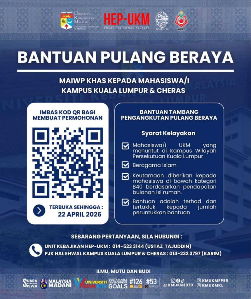 Berita baik buat mahasiswa Universiti Kebangsaan Malaysia (UKM), khususnya yang menuntut di Kampus Kuala Lumpur dan Cheras. Majlis Agama Islam Wilayah Persekutuan (MAIWP) kini membuka permohonan Bantuan Pulang Beraya sempena sambutan Hari Raya Aidilfitri 2026.