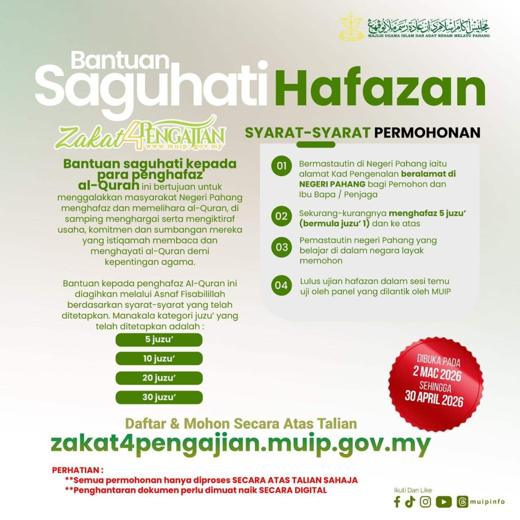 Bagi tahun 2026, permohonan Bantuan Saguhati Hafazan telah dibuka kepada individu yang memenuhi syarat kelayakan yang ditetapkan. Bantuan ini terbuka kepada mereka yang telah menghafaz sekurang-kurangnya lima juzu’ al-Quran dan bermastautin di negeri Pahang.