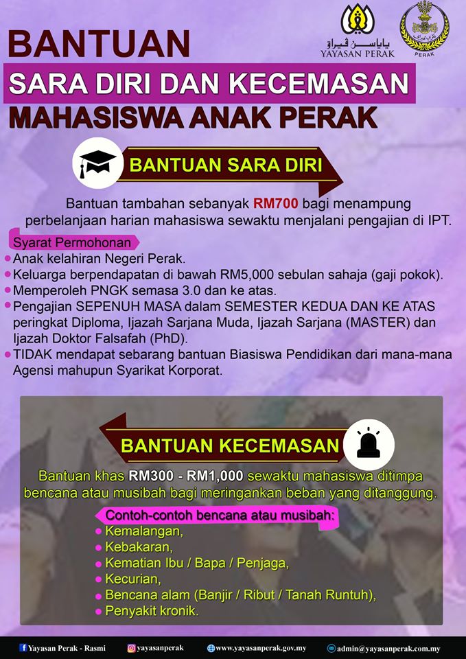 Semakan permohonan bantuan juga boleh dibuat dengan melayari Laman Web Rasmi Yayasan Perak melalui pautan di http://yayasanperak.gov.my/v5/ bawah atau hubungi di talian 05-255 2929.