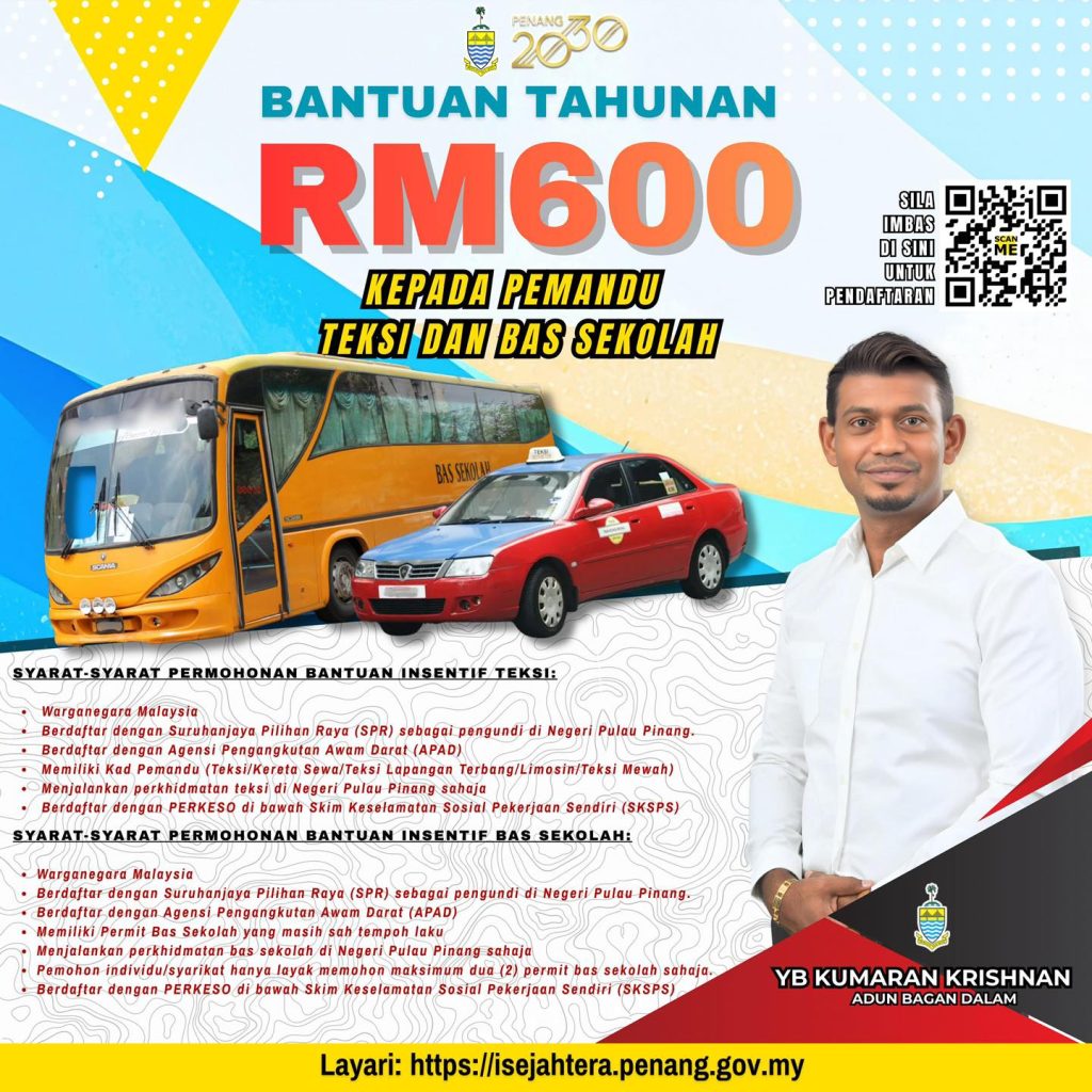 Golongan pemandu teksi dan bas sekolah memainkan peranan penting dalam sistem pengangkutan harian rakyat, khususnya pelajar sekolah. Bagi menghargai sumbangan mereka, Kerajaan Negeri Pulau Pinang menawarkan Bantuan Tahunan RM600 kepada pemandu yang layak.