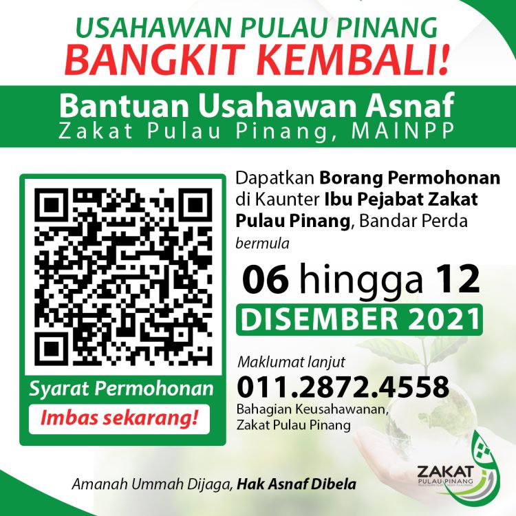 Majlis Agama Islam Pulau Pinang (MAIPP) mempelawa usahawan asnaf di Pulau Pinang untuk mohon Bantuan Usahawan Asnaf Zakat Pulau Pinang yang ditawarkan. Program ini bertujuan membantu usahawan di Pulau Pinang yang memiliki produk sendiri untuk kembali bersaing akibat terjejas teruk semasa pandemik Covid-19 dalam Perintah Kawalan Pergerakan (PKP) dilaksanakan.