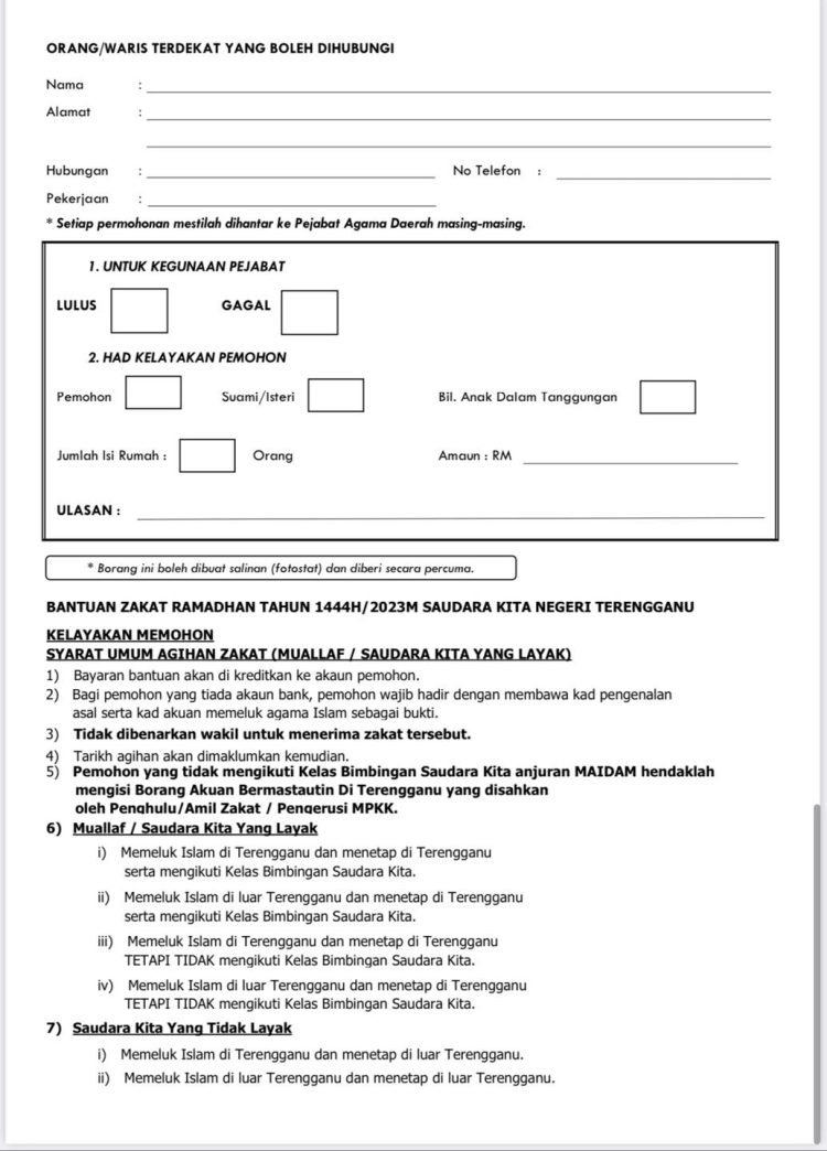 Panggilan buat Muallaf yang Memeluk Islam di Terengganu dan menetap di Terengganu. Dimaklumkan bahawa Bantuan Zakat Ramadhan disediakan adalah bertujuan untuk membantu asnaf muallaf bagi menampung perbelanjaan dan keperluan menyambut bulan Ramadhan tahun 1444H/2023M.