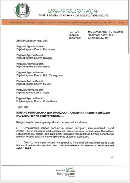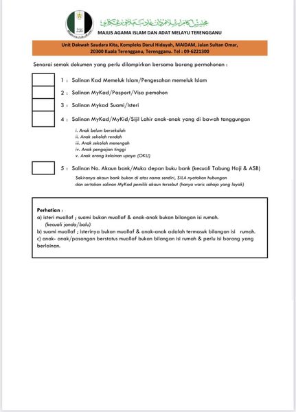 Panggilan buat Muallaf yang Memeluk Islam di Terengganu dan menetap di Terengganu. Dimaklumkan bahawa Bantuan Zakat Ramadhan disediakan adalah bertujuan untuk membantu asnaf muallaf bagi menampung perbelanjaan dan keperluan menyambut bulan Ramadhan tahun 1444H/2023M.