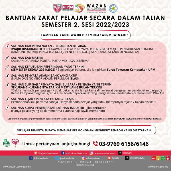Untuk info lanjut berkenaan permohonan bantuan zakat pelajar UPM, anda boleh hubungi: