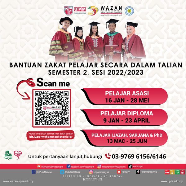 Pelajar-pelajar Universiti Putra Malaysia (UPM) di peringkat pengajian Bacelor, Master dan PhD boleh buat permohonan Bantuan Zakat Pelajar melalui Pusat Pengurusan Wakaf, Zakat dan Endowmen (WAZAN) secara atas talian bagi Semester kedua sesi 2022/2023 yang akan dibuka dalam bulan ini.