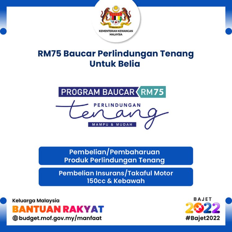 Bermula pada 1 Januari 2022, baucar RM75 akan diperuntukkan untuk penerima Bantuan Keluarga Malaysia (BKM) yang layak untuk membeli/menyertai produk Perlindungan Tenang atau memperbaharui pelan Perlindungan Tenang yang sedia ada.