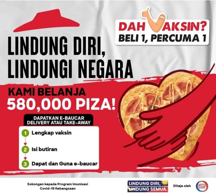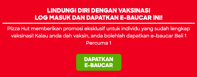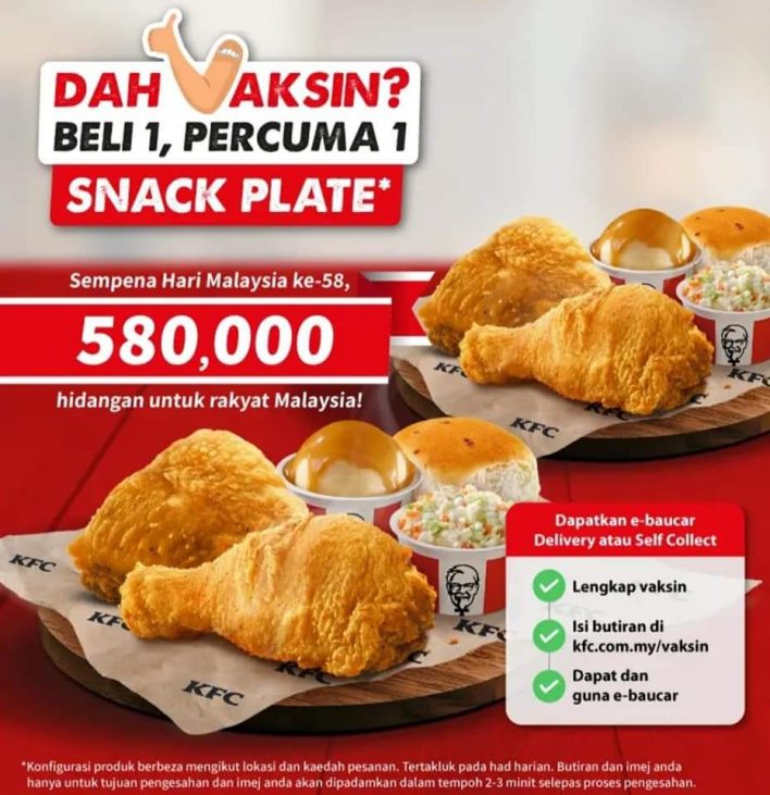 Anda dah lengkap 2 dos vaksin? Tahniah! Ada tawaran menarik buat anda! Jadilah yang terawal tebus baucar yang ditawarkan oleh KFC dan Pizzat Hut dengan tawaran Beli 1 Percuma 1 terhad sehingga tarikh tertentu.