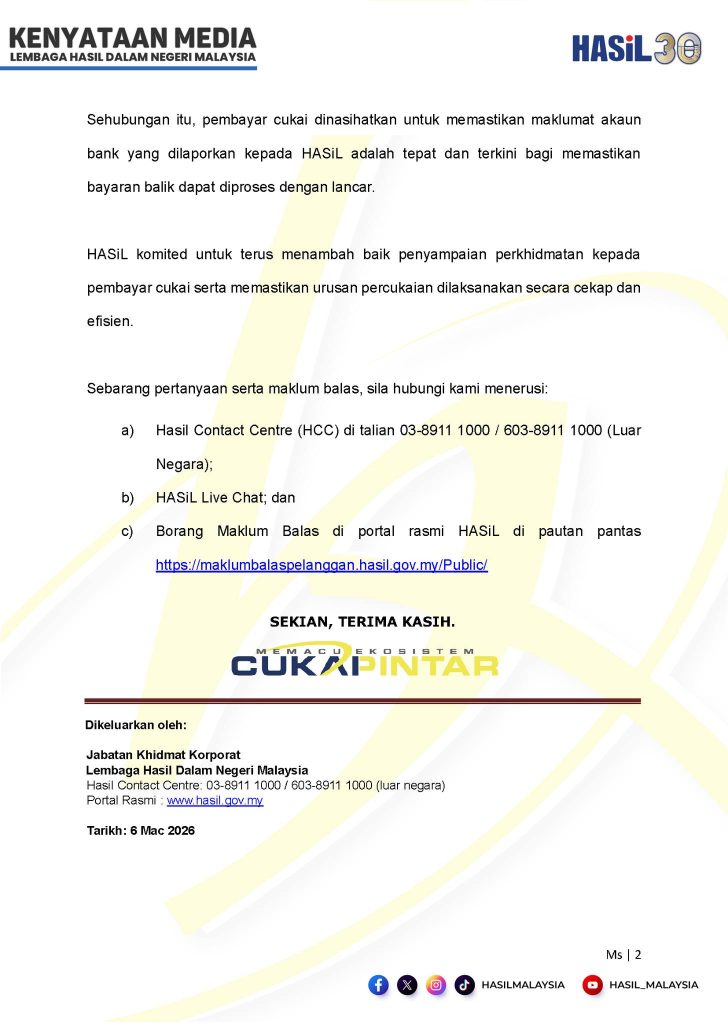 HASiL turut menasihatkan pembayar cukai supaya memastikan maklumat akaun bank yang didaftarkan adalah tepat dan terkini.